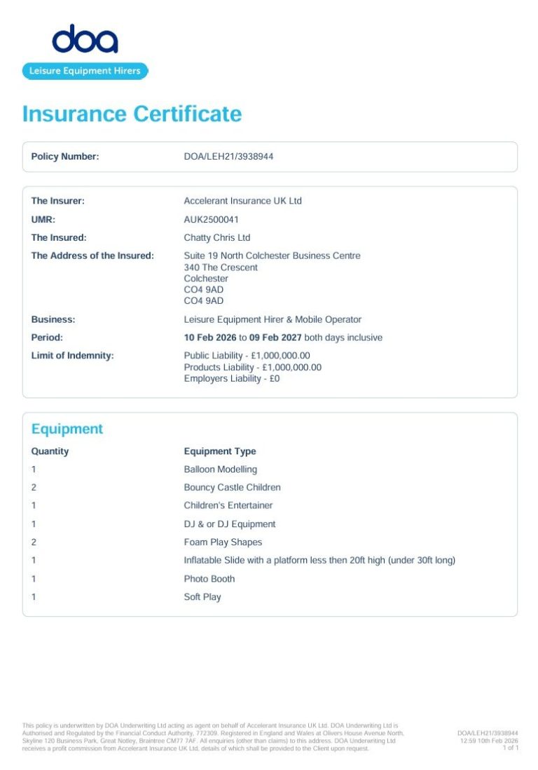 Bouncy Castle Hire Agreement & Terms By paying a deposit and proceeding with a booking, the hirer agrees to the following terms and conditions. 1. Booking & Payment • A non-refundable deposit is required to secure all bookings. • Bookings are not confirmed until the deposit has been received. • The remaining balance must be paid 28 days before event. (as agreed at booking). 2. Cancellation & Refund Policy The booking deposit is non-refundable under all circumstances. Customer cancellations • Cancellations made more than 4 weeks (28 days) before the event date will be refunded in full minus the deposit. • Cancellations made within 28 days of the event date will receive a 75% refund of the remaining balance after the deposit has been deducted. Date changes • We will try to accommodate date changes where possible. • Changes are subject to availability and cannot be guaranteed. 3. Weather Policy Inflatables cannot be used in unsafe weather conditions. We reserve the right to cancel delivery if weather conditions include: • Heavy rain • Thunderstorms • High winds (approx. 24mph / Force 6 or above) If we cancel due to unsafe weather, customers may: • Rearrange to a new available date, or • Receive a full refund including deposit. 4. Delivery & Setup Requirements The hirer must ensure: • Clear and safe access to the setup area. • The setup area is: o Flat and level o Clear of stones, debris and animal waste o Large enough for the equipment booked If safe access or suitable setup conditions are not available upon arrival, the booking may be cancelled and no refund will be issued. 5. Supervision & Safety Responsibilities The hirer is responsible for ensuring: • Adult supervision at ALL times while equipment is in use. • No shoes, glasses, jewellery or sharp objects on the inflatable. • No food, drinks, chewing gum, face paint, slime or confetti. • No climbing or hanging from walls or roofs. • No overcrowding or mixing of large and small children. Use of equipment is entirely at the hirer’s own risk. 6. Damage, Loss & Cleaning The hirer agrees to: • Keep the equipment safe and in good condition during hire. • Pay for any damage caused by misuse or negligence. • Pay cleaning charges if equipment is returned excessively dirty. 7. Equipment Use Rules The equipment must: • Not be moved once installed. • Not be used overnight unless agreed in advance. • Not be used in unsafe weather. • Only be used by the appropriate age group for the inflatable booked. 8. Liability Disclaimer All persons using the equipment do so at their own risk. Chatty Chris LTD cannot be held liable for: • Injuries or accidents • Damage to property • Loss arising from misuse or failure to follow these terms. Hire Agreement Confirmation By paying the booking deposit or any of the invoice amount, the hirer confirms that they: • Have read and understood these Terms & Conditions • Agree to follow all safety rules • Accept full responsibility for the equipment during the hire period.